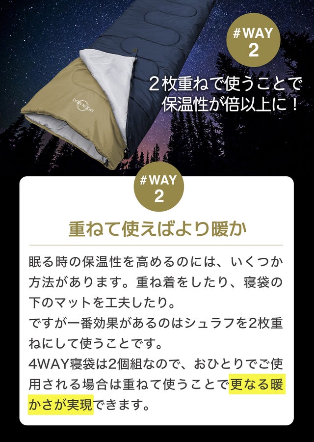- 使いみち広がる!フード部分がはずせて布団仕様に!4WAY寝袋
