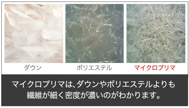ダウン特有の臭いやホコリのマイナス要素がなく、これまでの人工化繊素材より繊維が細く密度が高くなりました。
