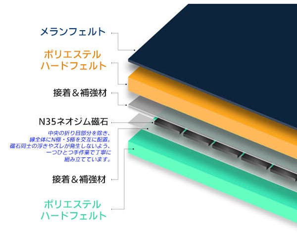 中央の折り目部分を除いた外枠全体にN極・S極を交互に配置することで、マグネット同士の浮きやズレが生じない構造になっています。
