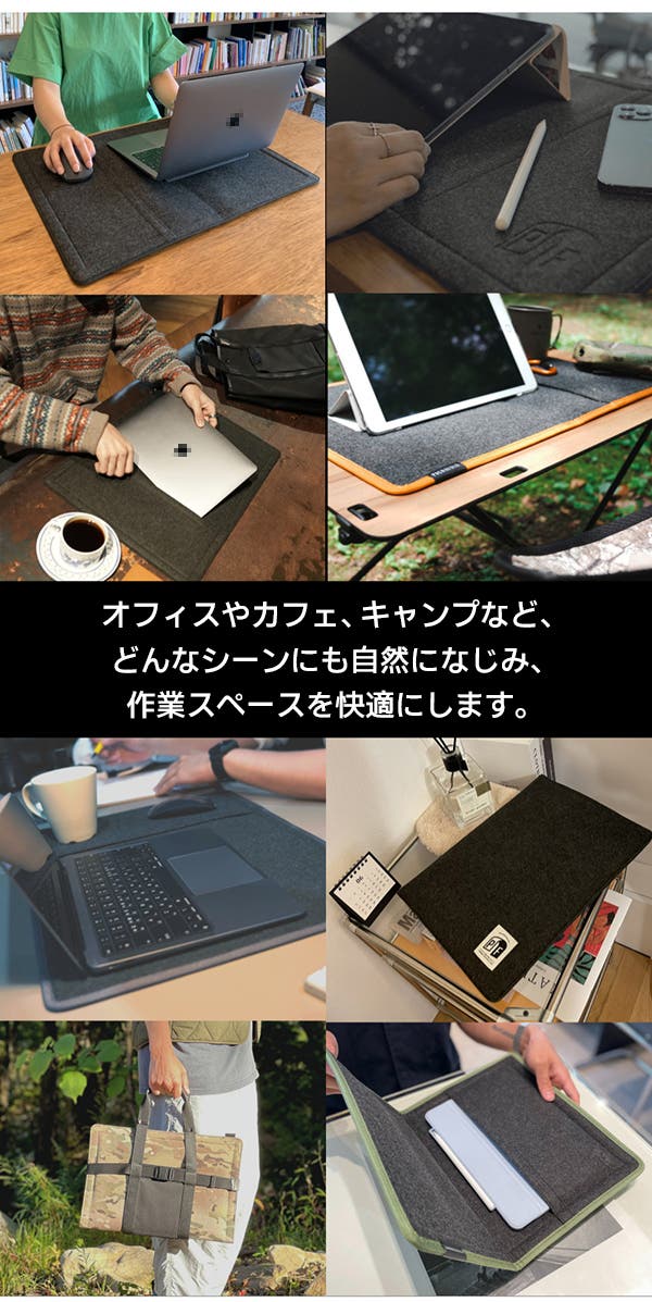 単なるノートPCケースの枠を超え、どんな場所でも自分だけの快適な作業スペースができます。