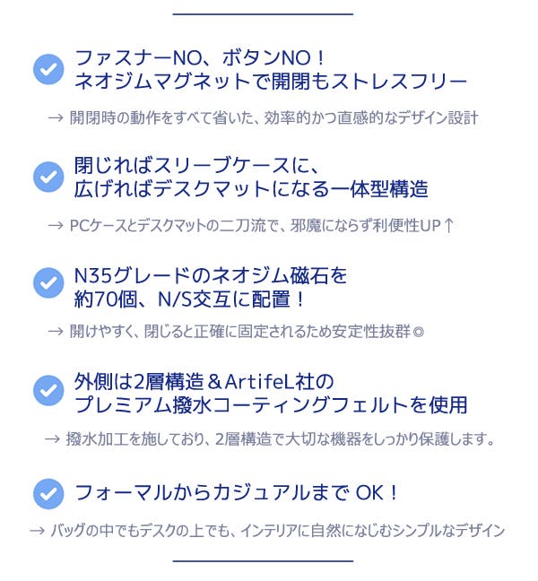 - ジッパーやボタンではなくN35ネオジム磁石を採用。手軽かつ安定的に開け閉めできます。
