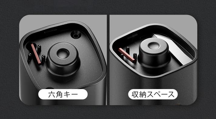 底部分には、刃や研磨用スティックを取り外す際に使う六角形のキーや替刃の収納スペースがあります。小さなパーツを収納しておけ、便利です。