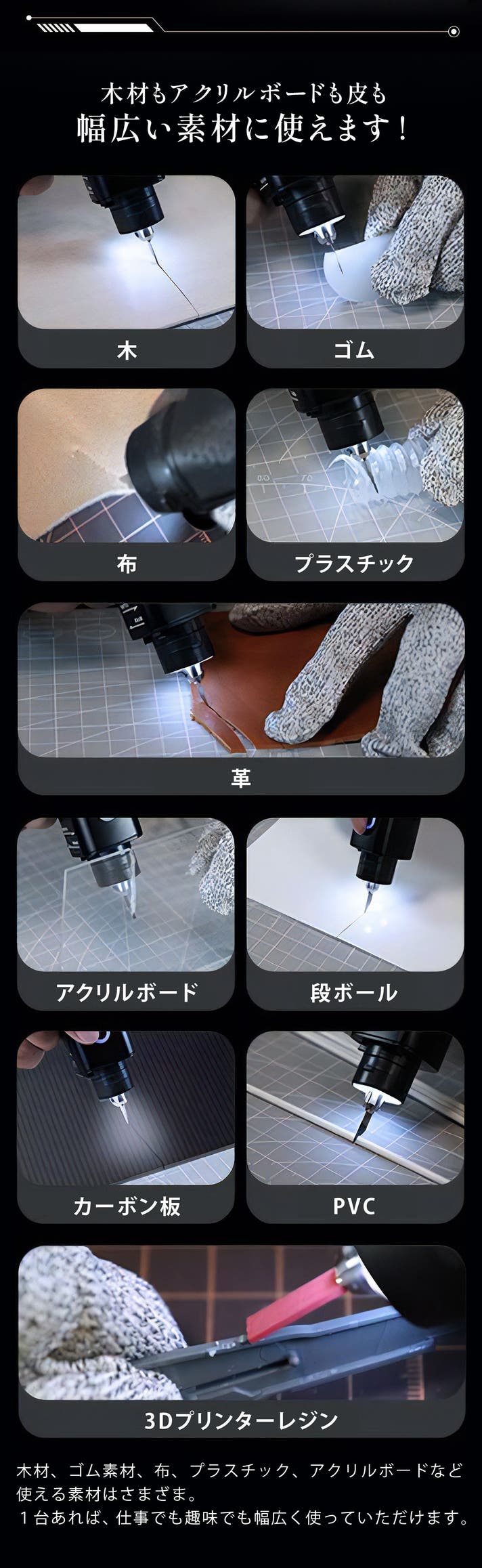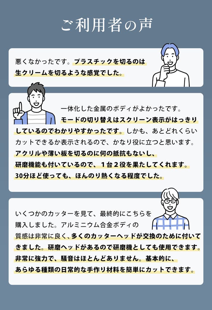 商品到着後すぐに、細かいカットも深いカットも、あなたが加工したいものを思いのままにカットできます。