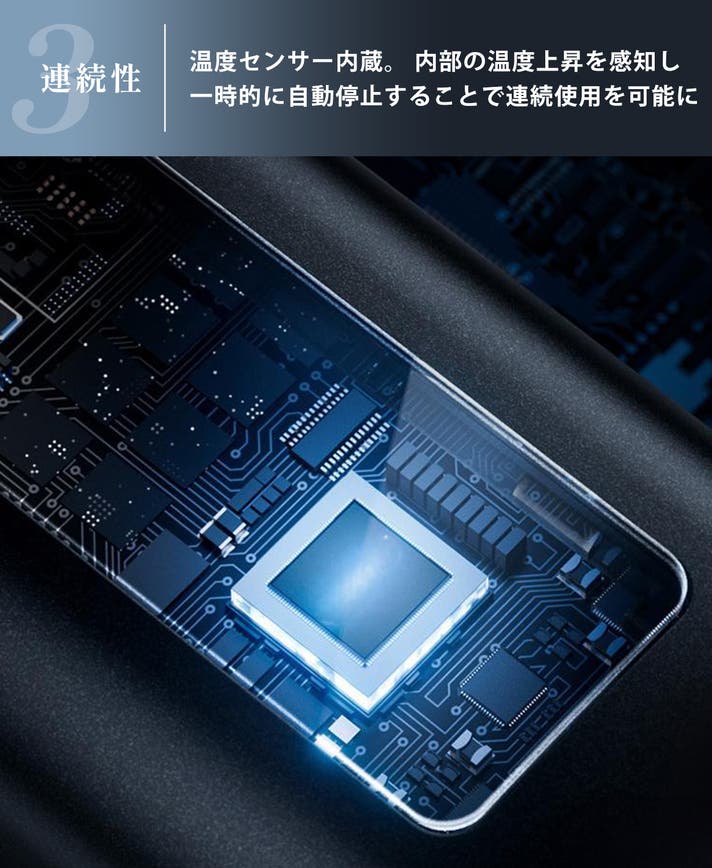 カッター内部に温度センサーを内蔵。発生する熱を感知すると、空気冷却システムが自動的に稼働し、ハンドルを冷却。過熱を防ぐので60分以上の連続使用が可能です。