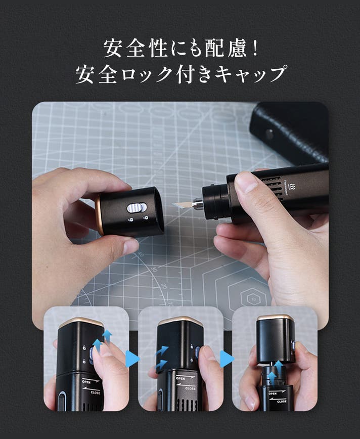 刃をカバーするキャップには安全ロックを搭載しました。