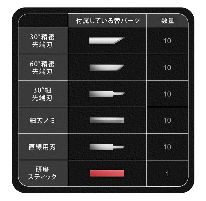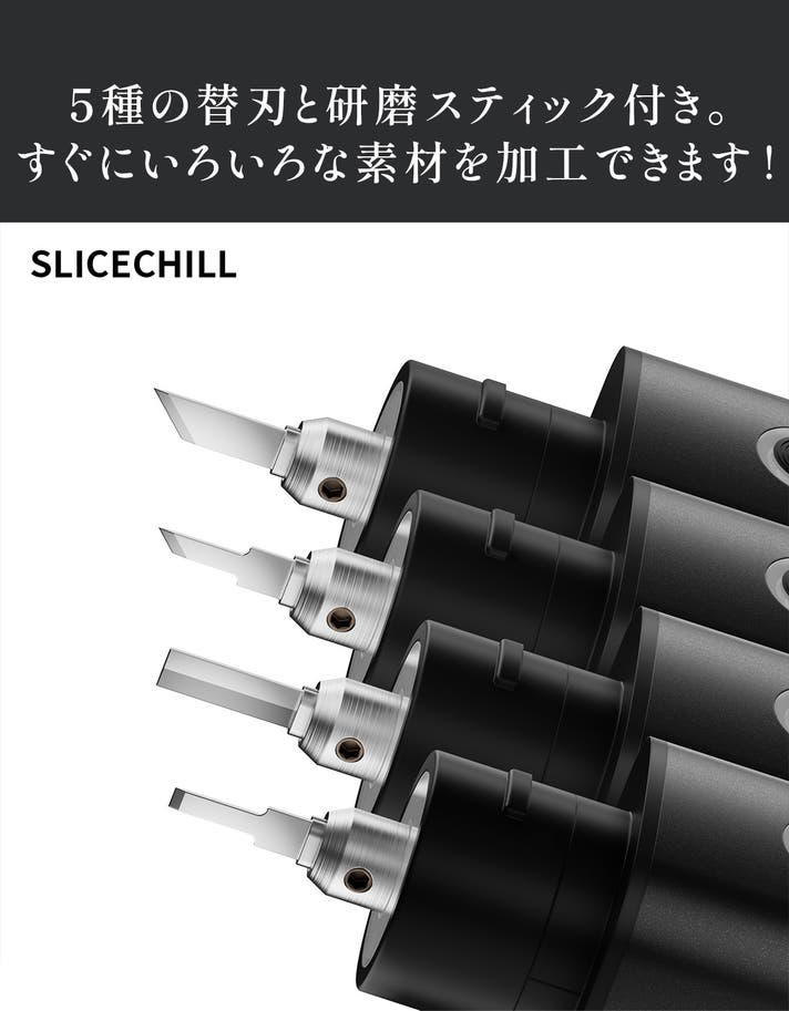 SLICE CHILL P10には、5種類の刃と研磨スティックが付いています。