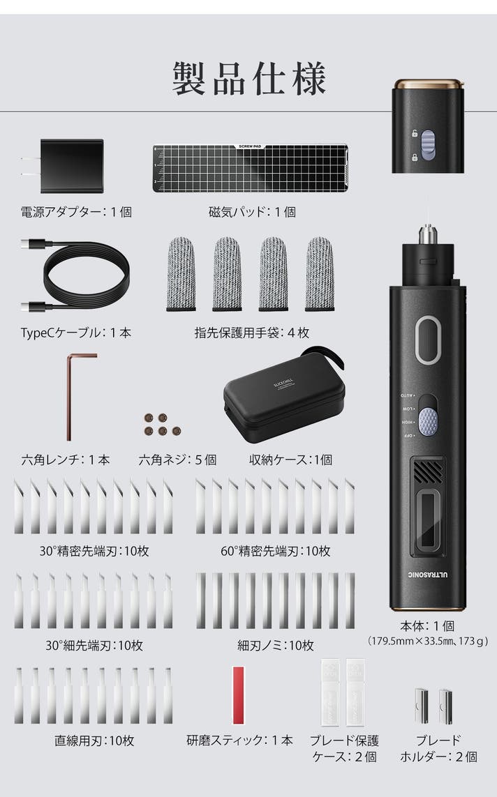- 研磨スティック付きで、切るだけでなく削る、磨くなど使い勝手が広がる!