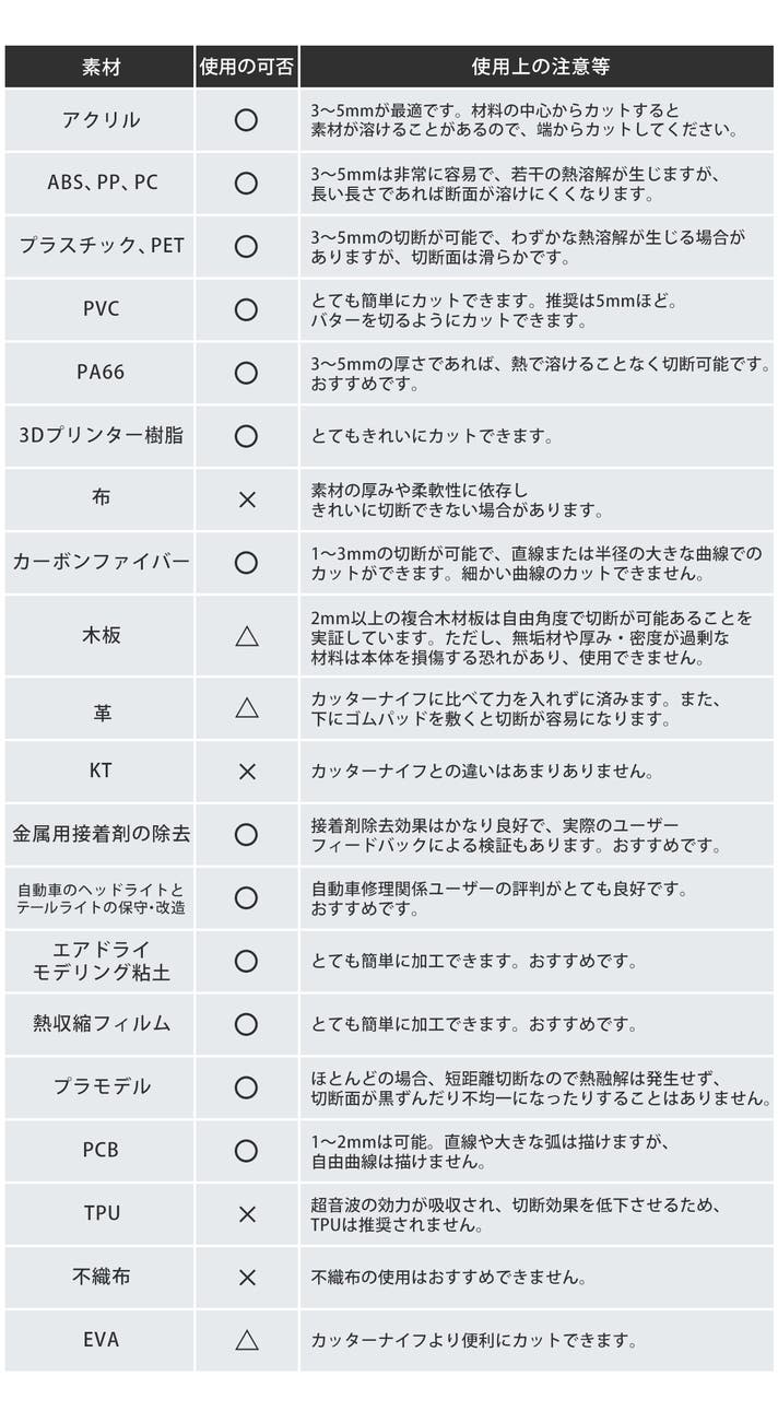 - 厚さ1mm~12mmまで対応。毎秒4万回の振動で仕上がりもキレイな超音波カッター