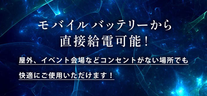 付属のケーブルはUSB TYPE-C給電に対応しています。 出力15V/2A以上(PD対応)のモバイルバッテリーをつなげば、コンセントのない場所でも、快適な切れ心地で使用していただけます。