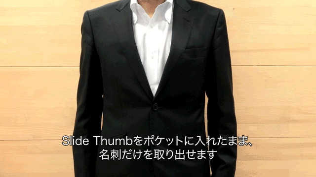 胸ポケットのスライドサムを取り出すことなく、指を差し入れて、手品のように名刺だけを取り出すこともできます。