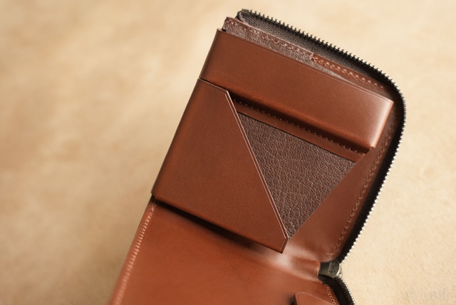 外側には、イギリスのブライドルレザーを使用しています。前作のslimで採用した革よりも高級な素材です。