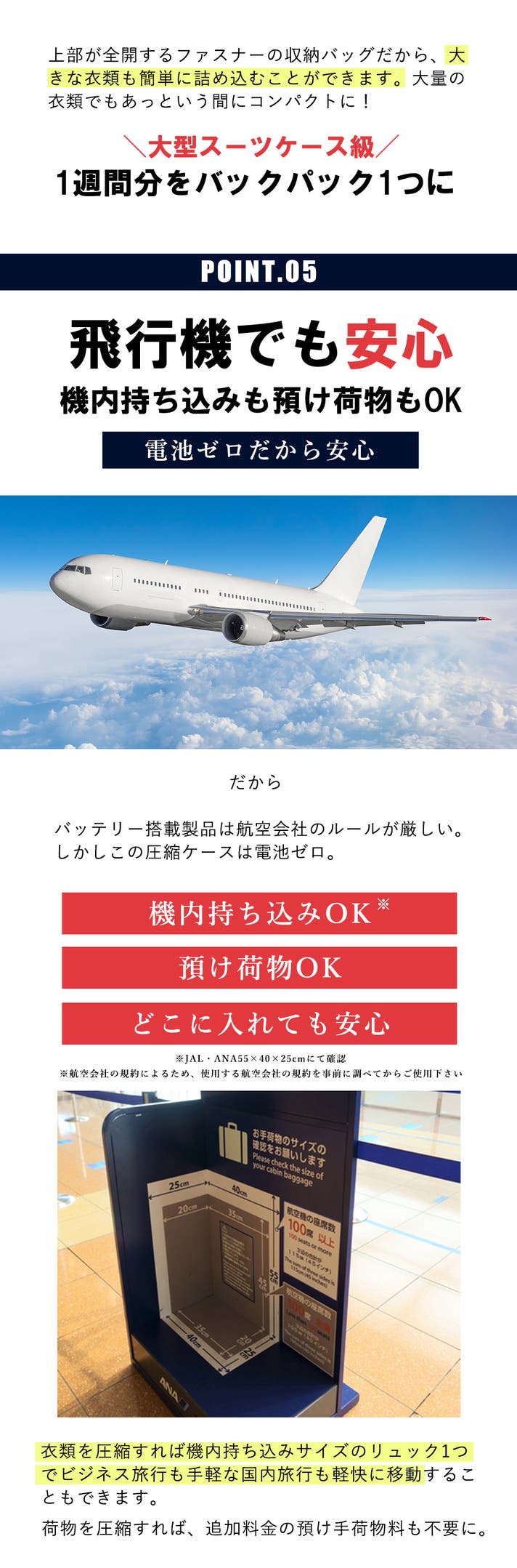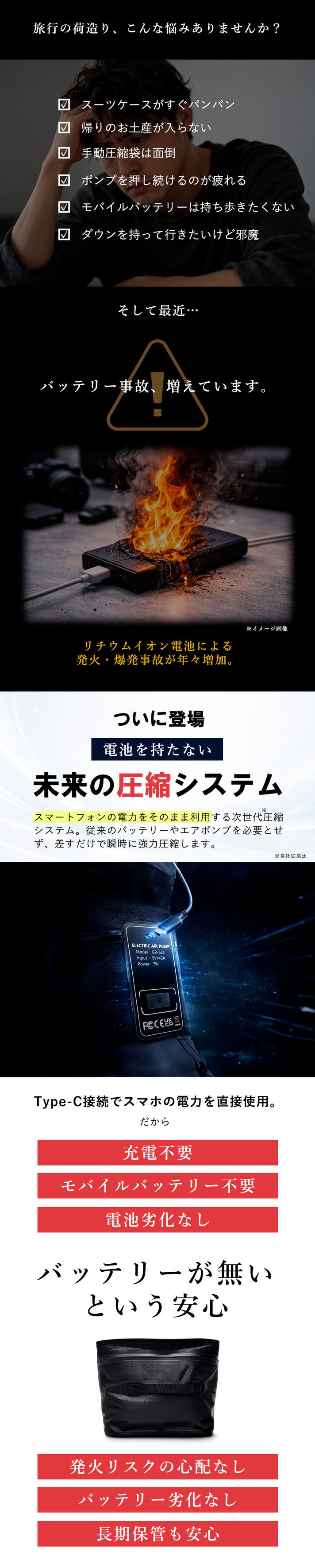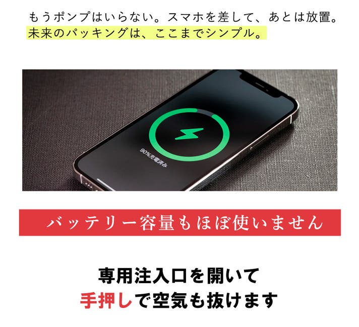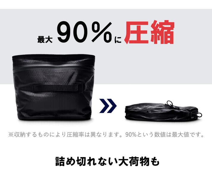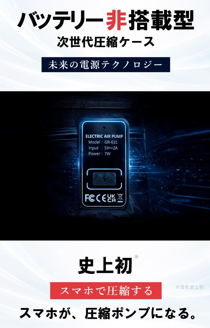 - スマホ接続だけで圧縮完了!ポンプ不要の次世代圧縮ケース!最大90%圧縮で荷物激減