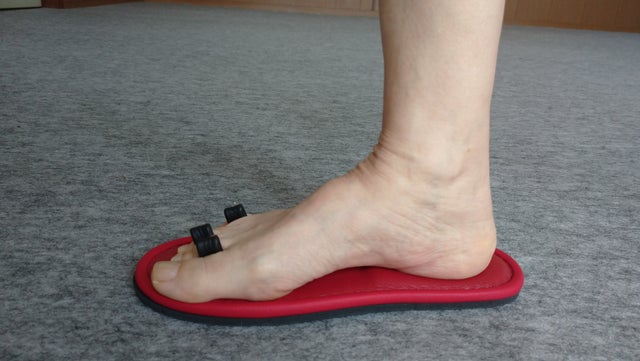 代わりに下駄の前坪をポールとして3本、スリッパの台部に設けてあります。足の指の股でそれらのポールを挟み、台部を持ち上げなければなりません。歩いても、台部が足の裏からズレることはありません。第一趾と第二趾で第1のポールを、第二趾と第三趾で第2のポールを、第四趾と第五趾で第3のポールをそれぞれの股が挟み込み、台部を持ち上げます。