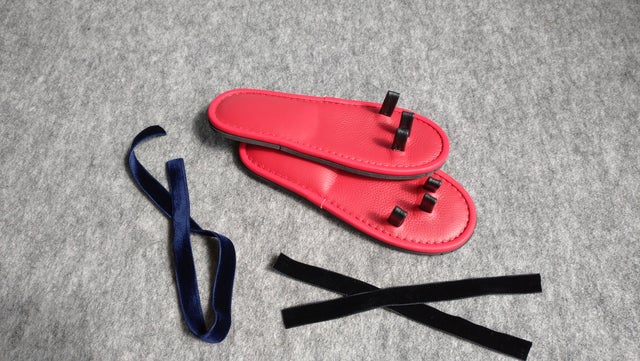 リボンを第一趾と第2趾の股のポール(鼻緒)に取り付けててみました。市販されている、ファー・ボールを取り付けても面白いと思います。