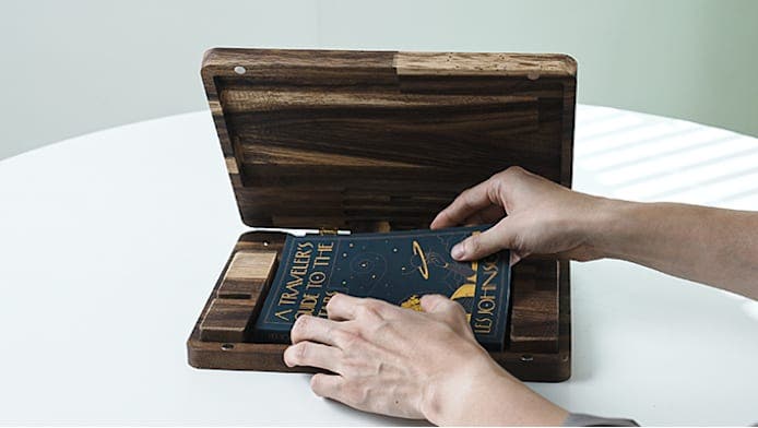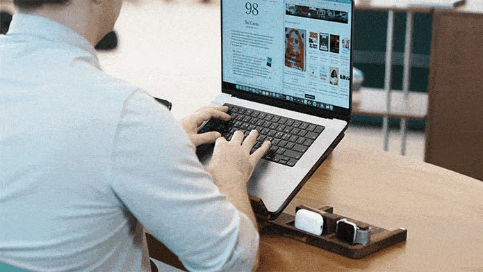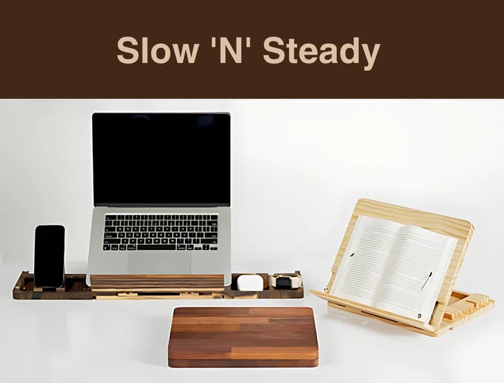 Slow ‘N’ Steady は単なるブックスタンドではありません。MacBook、iPhone、Airpods などを持ち運び、整理できるポータブル ワークスペースです。現代の必須電子機器を幅広くカバーしています。