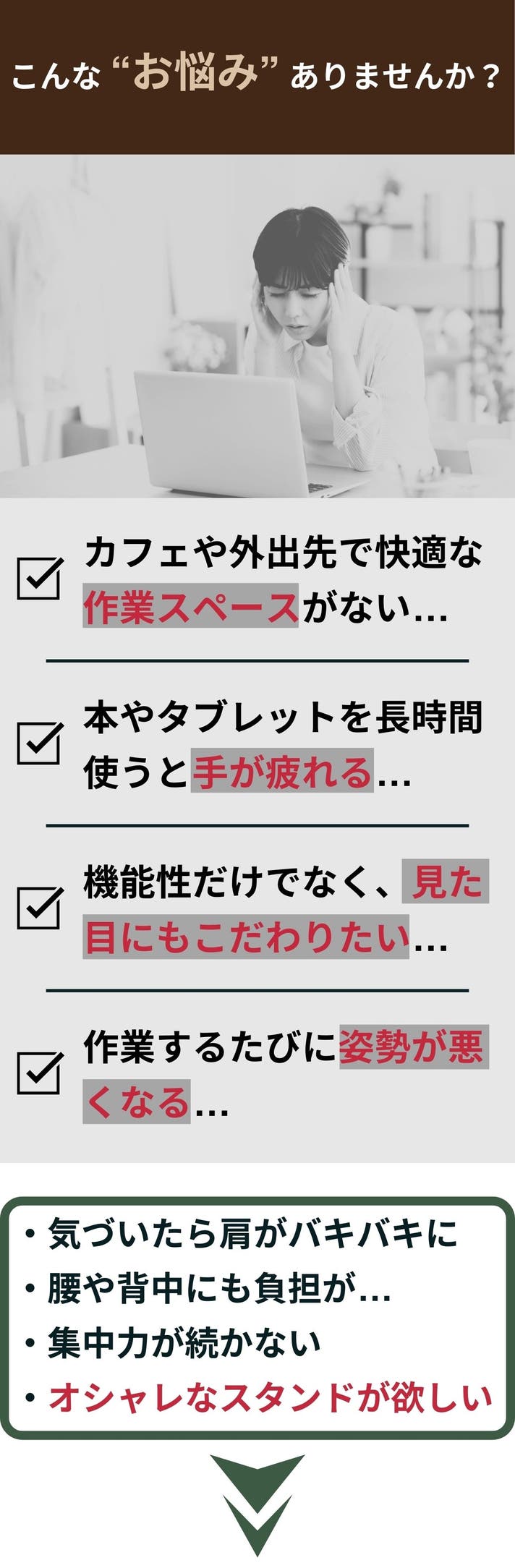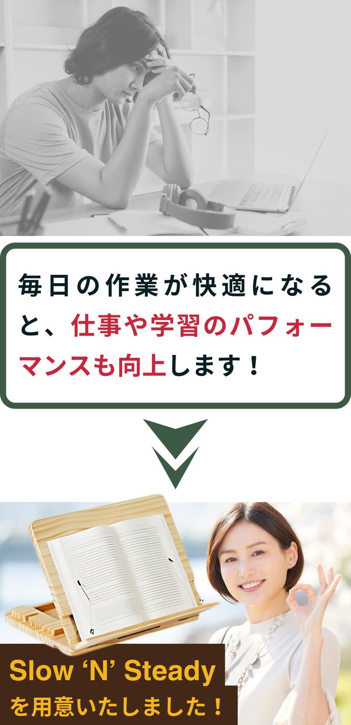 自分好みの最適な角度でノートPC、タブレット、本などを支え、 長時間の使用でも首や肩の負担を軽減。