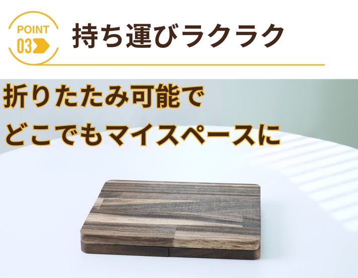 折りたたみ式でコンパクトに収納でき、持ち運びもラクラク。デスクワークの負担を軽減し、より快適な作業環境を実現しました。