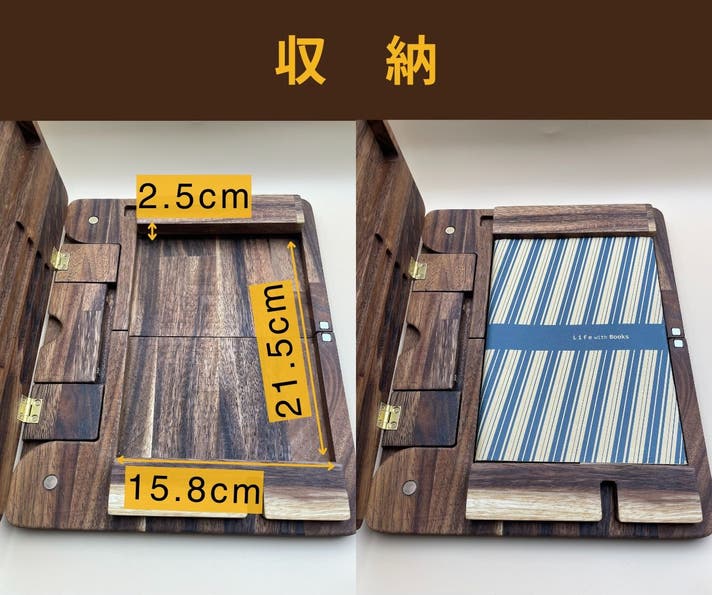 A. 縦21.5cm×横15.8cm×高さ2.5cmのスペースがあります。本、書類、小物などの収納が可能です。