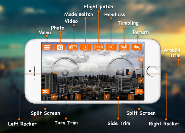 SMAOアプリを起動させると、操縦に必要なコントローラが表示されます。これらをタップ、スワイプすることによって操縦を行います。