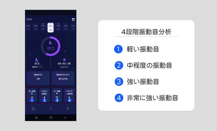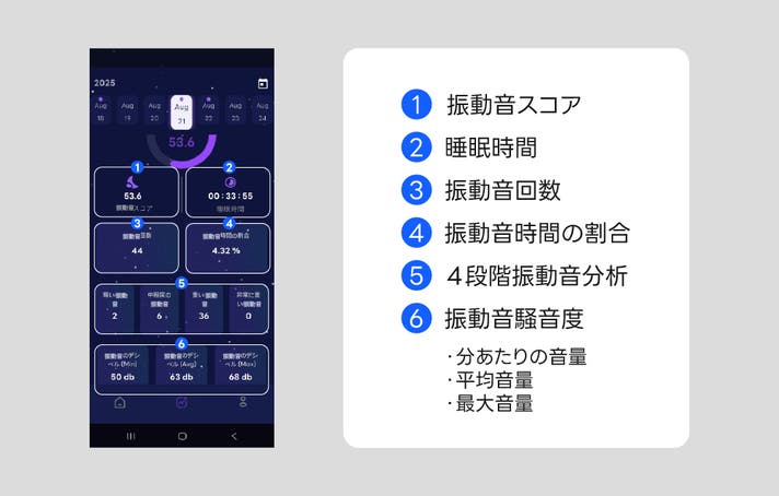 専用アプリで、睡眠時間・振動音の回数・音量・時間帯などを詳細に記録し、グラフで可視化します。