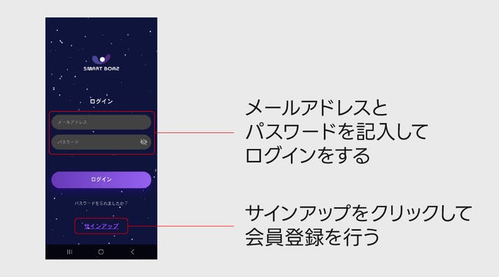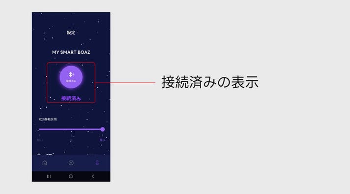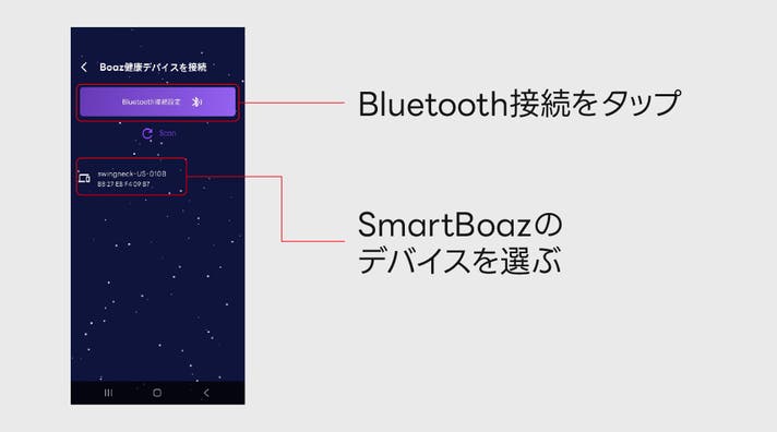 設定画面で「Bluetooth接続」をタップし、 リストから「SmartBoaz」デバイスを選んで接続します。