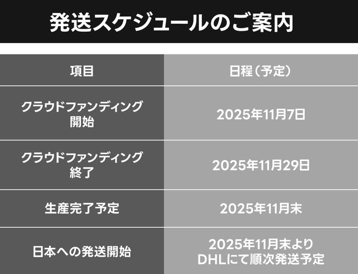 並行輸入品が発生する可能性があります。正規以外での個人輸入等は、完全に防ぐことができない場合がございます旨、予めご了承のほどお願いいたします。 並行輸入品は正規代理店による製品保証を受けることができません。 また、正規代理店を通じて購入することで、日本国内での流通に必要な各種認証の取得や、関税の適切な処理が担保されます。 【配送遅延とキャンセルについて】 本文中に記載させていただいたスケジュールは、あくまでプロジェクト公開時点の予定です。 応援購入の性質上、配送遅延のおそれがございます。 原則として、配送遅延に伴う応援購入のキャンセルはできませんが、リターン配送予定月から 3ヶ月 を超えた場合には、希望者に限りキャンセルにて対応させていただきます。 【商品等の不具合による返品・交換】 対応条件: 商品の初期不良、またはお届けした商品がご注文内容と異なる場合、商品到着後14日以内にプロジェクトページの「実行者にメッセージ」よりご連絡ください。状況を確認の上、返金または良品交換にて対応いたします。 返金額: リターン金額(税込)の全額 返品送料/再送料: 実行者負担 返品・交換をお受けできない商品: サポーター様の責任により破損・汚損が生じた商品 商品のタグ、付属品、パッケージ(箱、袋など)を紛失または破棄された商品 事前にご連絡をいただいていない商品 商品到着後15日以上経過した商品 交換をお受けできないケース: 限定品や同一商品の在庫がない場合など、代替品をご用意できない場合