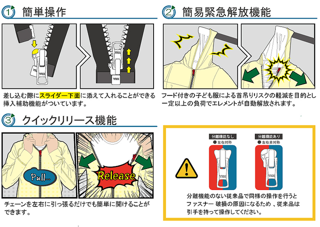 キッズ用のZIP UPパーカーには、「キッズデザイン賞」で最優秀賞の「内閣総理大臣賞」&「グッドデザイン賞」で金賞を受賞したYKK製の特殊ファスナー「QuickFree」を採用。