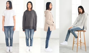 女性モデル 162cm ジーンズ ミッドブルー "S"/パーカー ベージュ”Free”