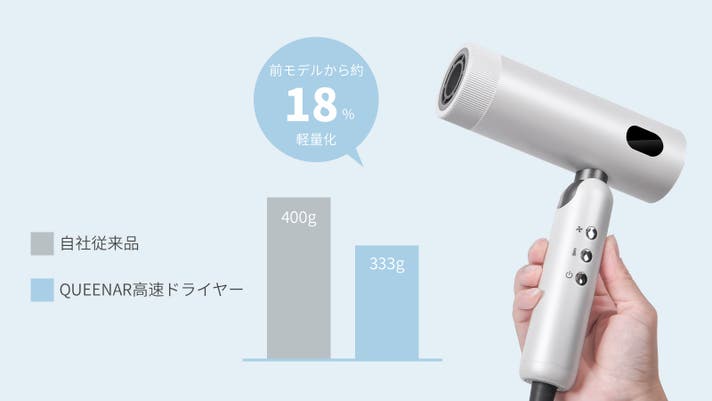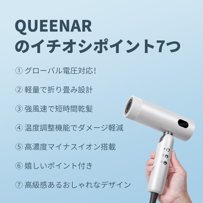 今回紹介致す「QUEENAR高速ドライヤー」は、コンパクトかつ超軽量なデザインで、使用時に手に負担が少ない製品です。従来の製品と比べて大幅に軽量化されているにもかかわらず、風速と風量は変わりません。大風量のため、低温でも速乾が可能で、サロン仕上げの髪を実現します。デザインもシンプルでおしゃれ、高級感のある質感を持ち、いつでも使いたくなる魅力があります。ぜひご応援ほどお願いいたします。