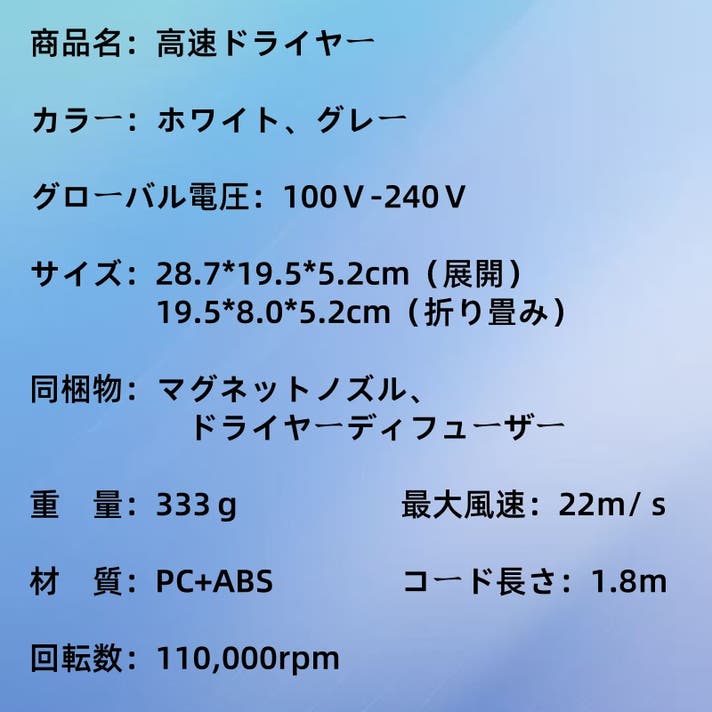 世界対応電圧で海外旅行も安心!パワフルな風量が素早く髪を乾かし、ながら軽量コンパクトボディで収納ラクラク。スマートに折りたたんでバッグにスッキリ収納可能です。