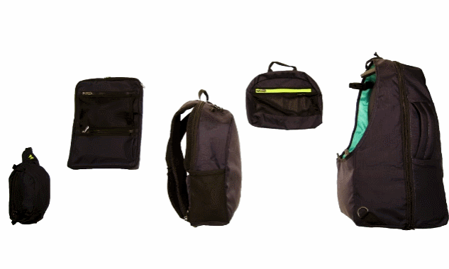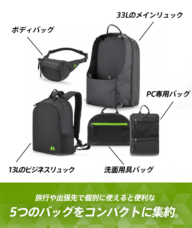 - メイン、ビジネス、ボディ、PC、洗面用具と5つのバッグがワンセット。多目的バッグの決定版。