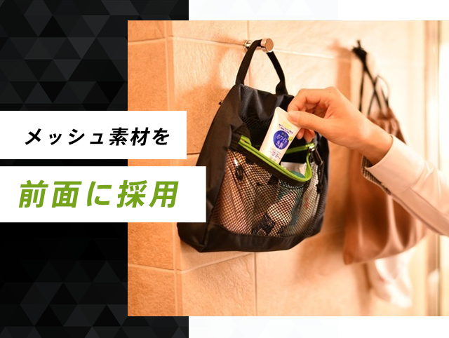 洗面用具バッグは中身が見えて通気性の良いメッシュ素材を前面に採用。