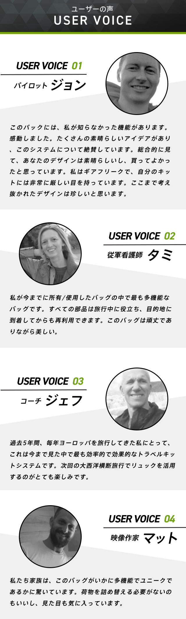 20年ほど前から、「ジェームス・ボンドのように、何の前触れもなく突然、他国に飛んで行って世界を救わなければならないとしたら、どんなギアで準備を整えていればよいだろうか」とイメージを膨らませ、「日常から通勤、旅行者へ」とスムーズに移行できるような優れたモジュール式バッグのアイデアを描いていました。