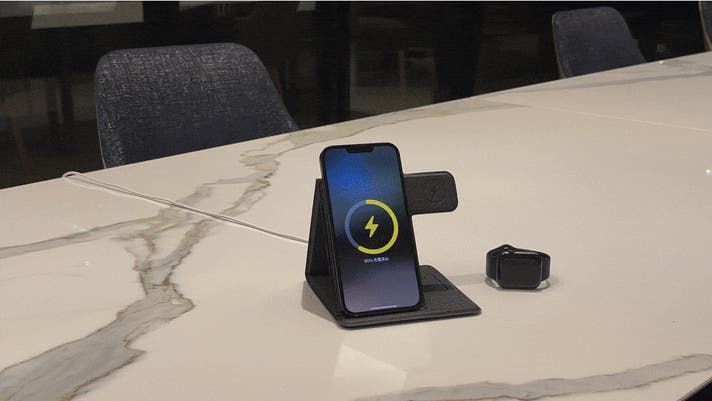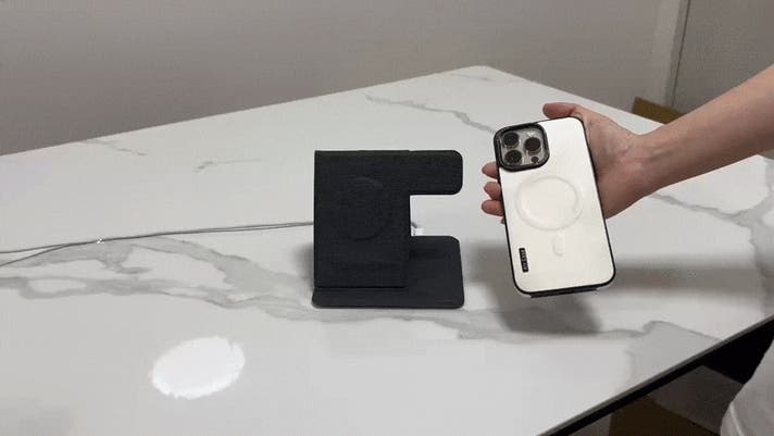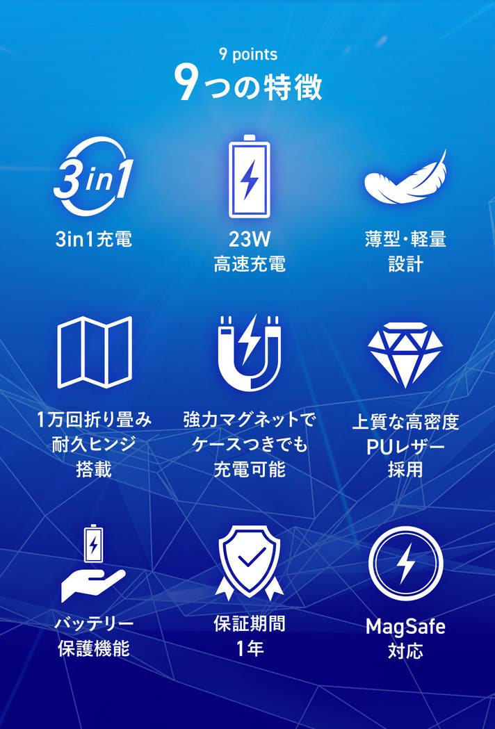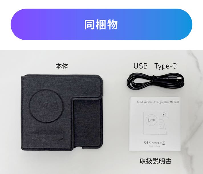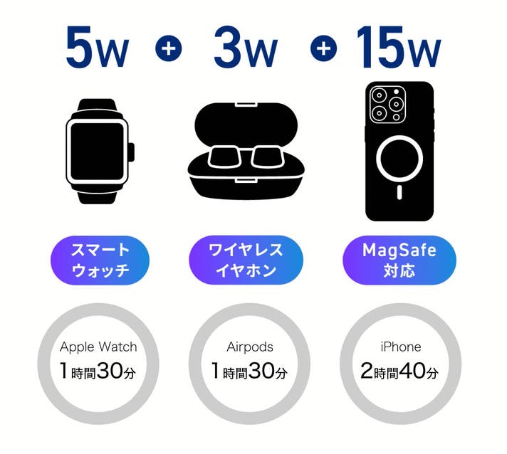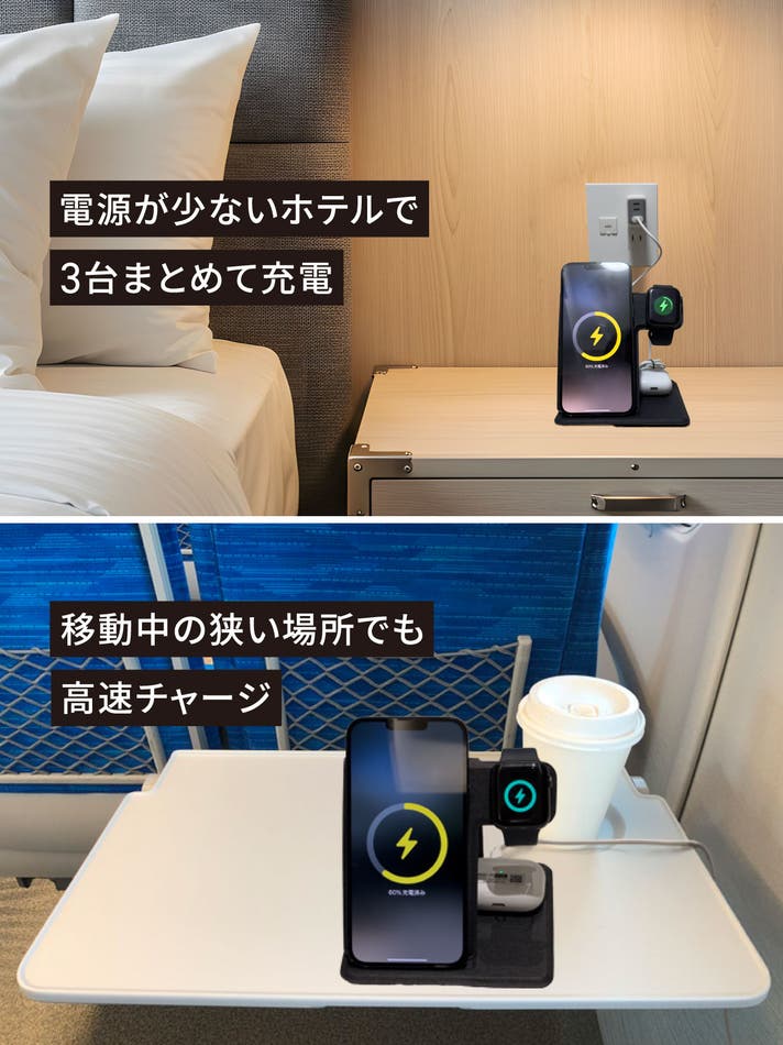 - 3in1でスマホ、ワイヤレスイヤホン、スマートウォッチを同時に充電でき、出張時の荷物を最小化!