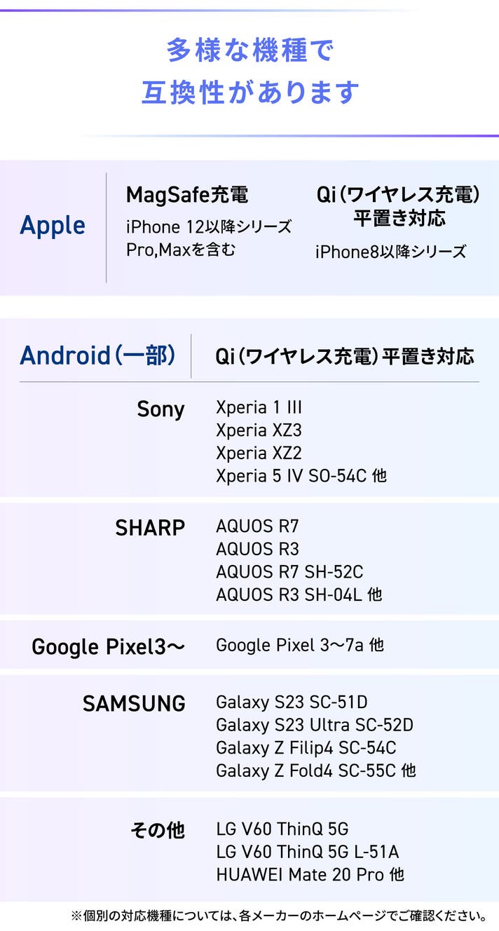 iPhone 12以降のMagSafe対応機種はマグネットで吸着可能です。AndroidでもQi規格対応であればワイヤレス充電可能です。