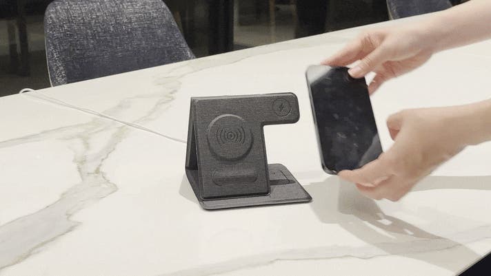 何度も試作を重ね、厚さわずか2cmの超薄型設計、折りたたみ構造、3台同時充電という仕様を実現しました。