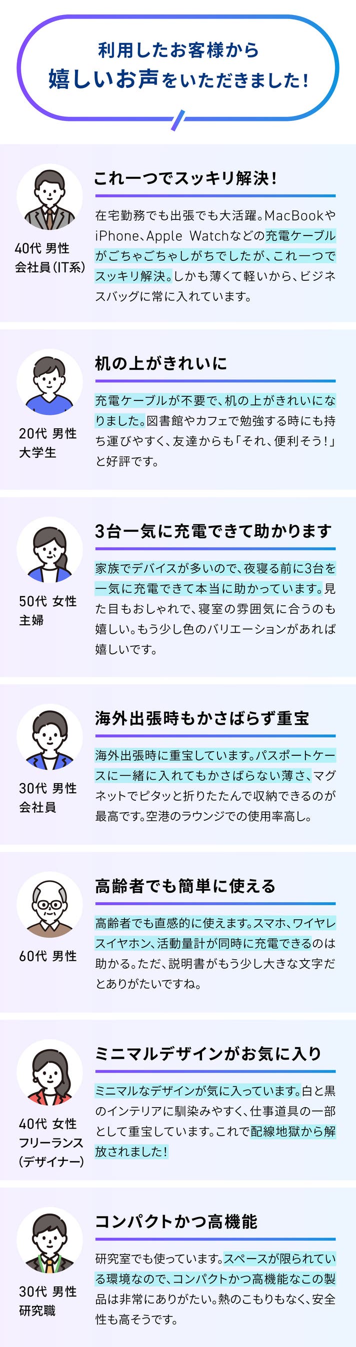 複数のデバイスを使うのが当たり前になった今だからこそ、1台でスマートにまとめて充電できるアイテムが必要だと感じ、何度も試作を重ねて形にしました。
