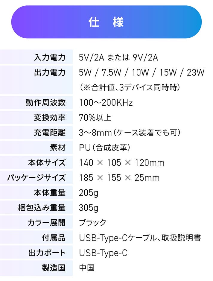 最大出力は合計23W(スマホ15W/Watch3W/イヤホン5W)です。