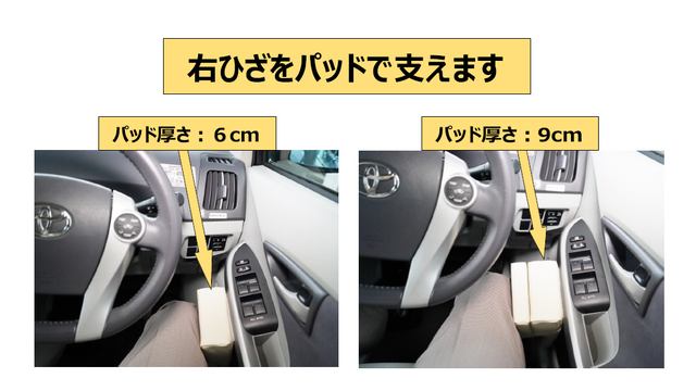 本パッドは運転席右側ドアにマジックテープを2か所貼り付けて簡単に取付けができます。右ひざを支えるパッドの標準厚さは6cmで、一部を折りたたむと厚さは9cmに変化する構造です。