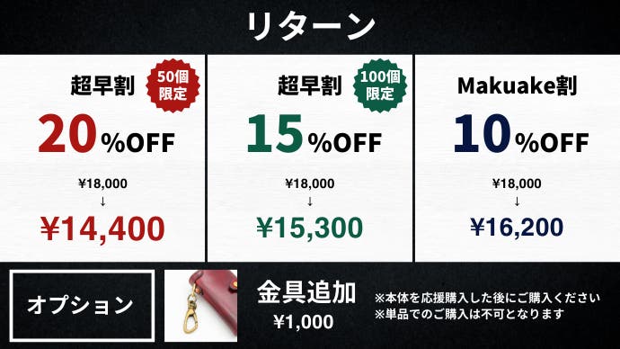 ※革の供給状況、製造工程上の都合等により出荷時期が遅れる場合がございます。 ※革の仕入れ(ロット)によって色合いが当初予定と異なる場合がございます。天然皮革の証としてご了承のほどお願いいたします。 ※染色は手作業のため掲載している画像と仕上がりが異なる場合がございます。ご了承のほどお願いいたします。 ※天然皮革のため、動物本来の自然傷、シワやシミ、血筋痕、斑点などが見られる場合がございます。革の個性としてお楽しみいただけますと幸いです。 ※上記の天然皮革の特性を理由にした返品や交換は承ることができませんので、ご理解・ご了承いただけますと幸いです。 ※色落ち、色移り等、お取扱いにはご注意下さい。 ※表記サイズ、内容量、重量には多少の個体差があります。 ※お使いのモニターや端末によって見えるカラーが異なる場合がございます。 ※デザイン・仕様は変更する場合がございます。あらかじめご了承ください。 ※皆様の応援購入により量産効率が向上した場合、正規販売価格が販売予定価格より下がる可能性もあります。 ※開発中の工程において、デザイン・仕様が一部変更になる可能性もございます。 【配送遅延とキャンセルについて】 本文中に記載させていただいたスケジュールは、あくまでプロジェクト公開時点の予定です。応援購入の性質上、配送遅延のおそれがございます。原則として、配送遅延に伴う応援購入のキャンセルはできませんが、リターン配送予定月から 3ヶ月 を超えた場合には、希望者に限りキャンセルにて対応させていただきます。 【キャンセル・返品について】 原則として、サポーター都合によるキャンセル・返金は承っておりません。 (サポーター都合のキャンセル不可の例:サイズが合わない、誤注文、長期不在) ただし、商品の初期不良、またはお届けした商品がご注文内容と異なる場合、到着後14日以内にプロジェクトページの「実行者にメッセージ」よりご連絡ください。状況を確認の上、返金対応、または良品との交換対応をさせていただきます。 返金額: リターン金額(税込)の全額 返品送料/再送料: 実行者負担(返品時は着払いにてお送りください) 【返品・交換をお受けできない商品】 ・サポーターの責任により破損、汚損が生じた商品 ・商品のタグ、付属品、パッケージ(箱、袋など)を紛失、破棄された商品 ・事前にご連絡をいただいていない商品 ・商品到着後、15日以上経過した商品