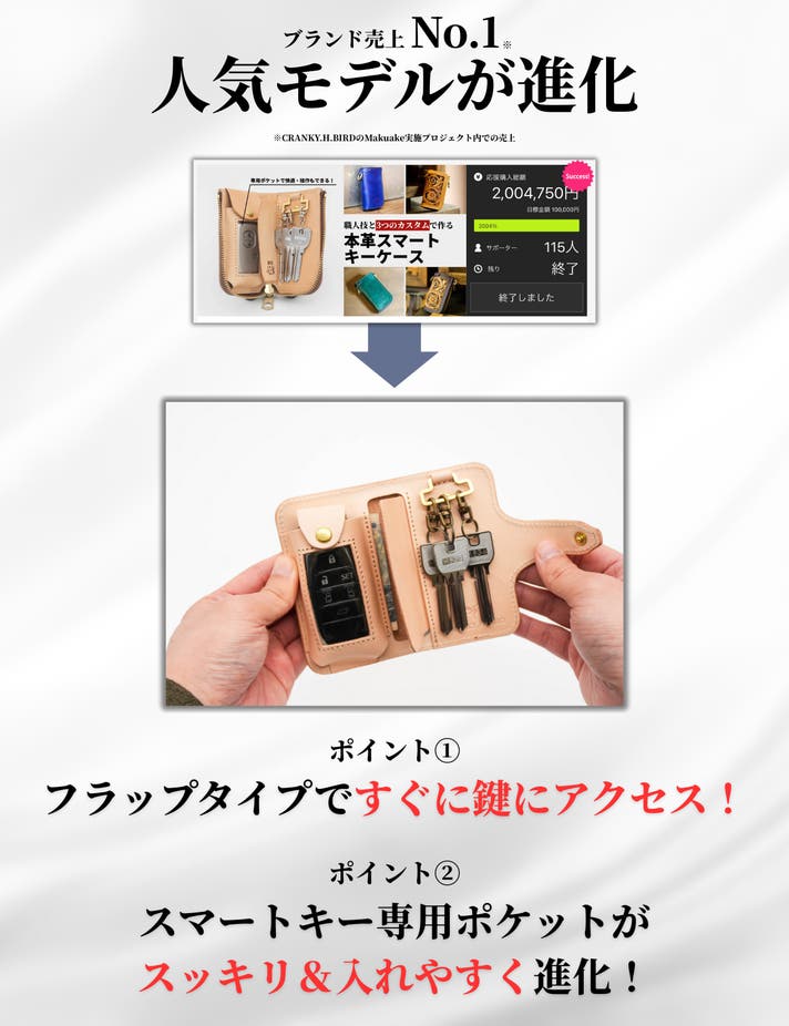 「Makuake(マクアケ)」は、実行者の想いを応援購入によって実現するアタラシイものやサービスのプラットフォームです。このページは、 ファッションカテゴリの 「【秒速アクセス】機能性と美しさを追求!本革でカスタムできるスマートキーケース」プロジェクト詳細ページです。