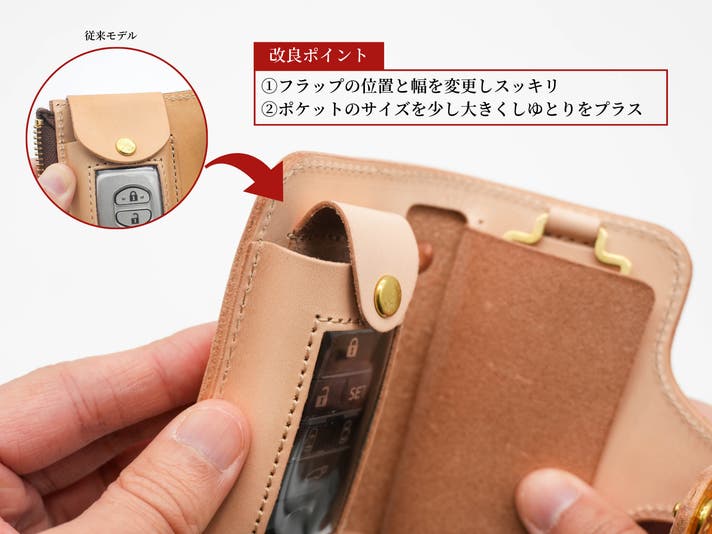 形状の変化だけでなく「スマートキー専用ポケットのデザインの見直し」「ミニポケットの新設」「隠しポケットの追加」など、さまざまな改良を施しております。