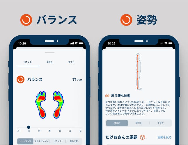 インソールからデータが送信され、スマホアプリで姿勢や運動に関するデータが確認できます。