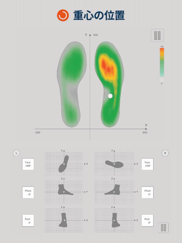 歩き方や重心のデータを取得するので、前ももに頼りすぎる歩き方など脚のお悩みの原因を見える化することができます。