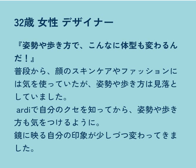 私は元々パーソナルトレーナーとして多くの人の身体づくりに携わり、現在もardiが運営する姿勢・歩行分析サービス「ASHI DOCK」や脚のトレーニングスタジオ「ASHINO STUDIO」で、日々さまざまな人の歩きや姿勢を見ています。