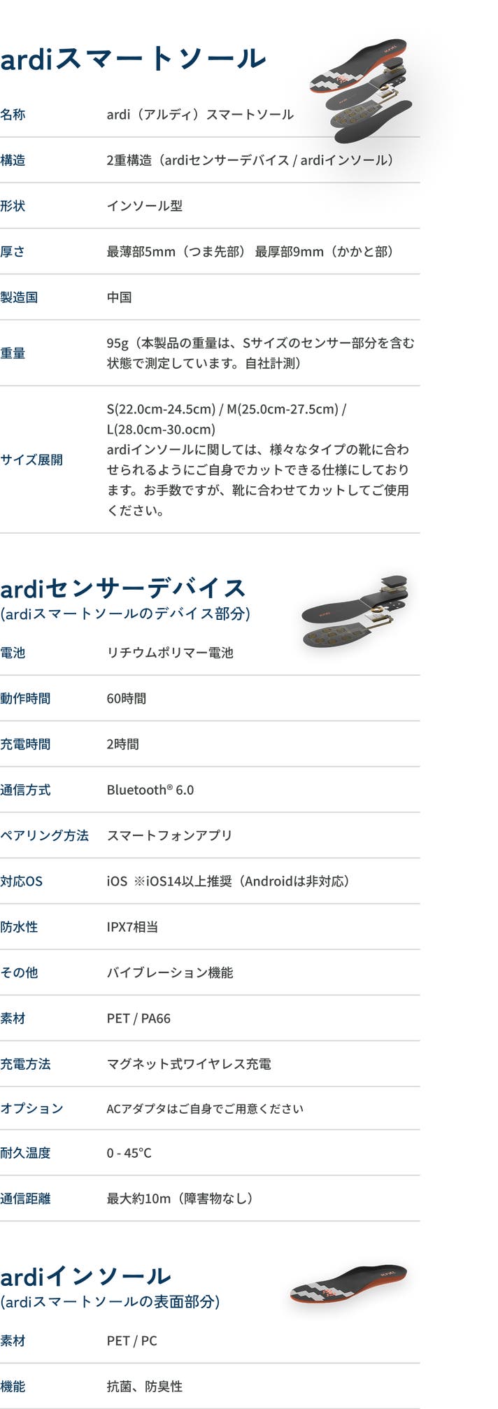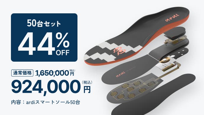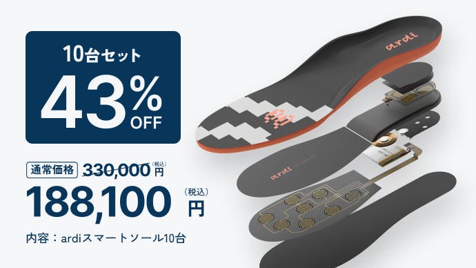 A:ardiは、足に装着する次世代スマートソールです。歩行や姿勢をセンシングし、AIコーチが日々の動作を分析・アドバイスする足元からあなたを支えます。