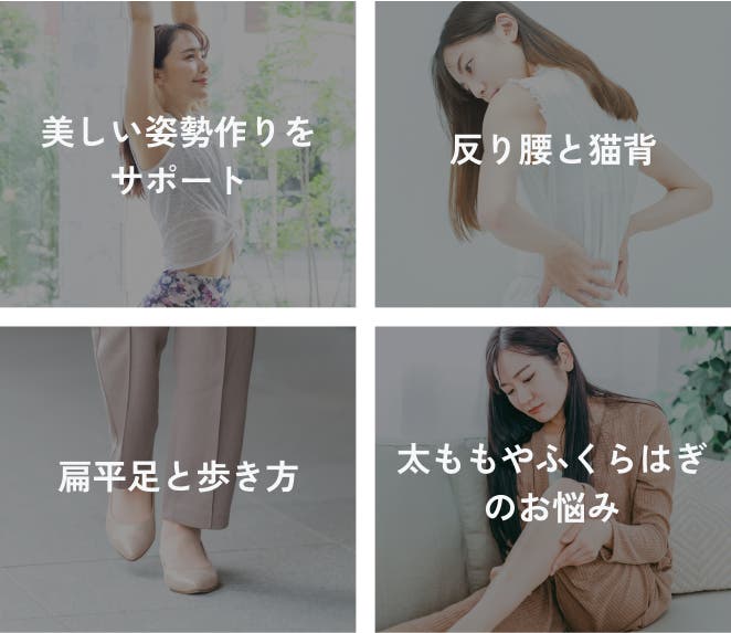 毎日の姿勢データから、姿勢タイプを診断します。歩行時の重心偏りにも気づけるため、反り腰や猫背の正しい姿勢の習慣化を後押しします。