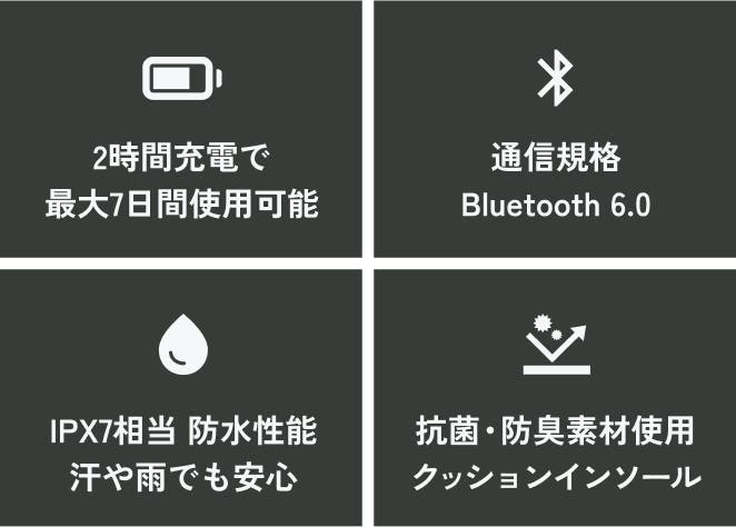 IPX7相当の防水性能を備えているため、日常の汗や雨による濡れにも安心して使用いただけます。運動中でも、天候を気にせず着用できる設計で、アクティブな日常にしっかり対応します。