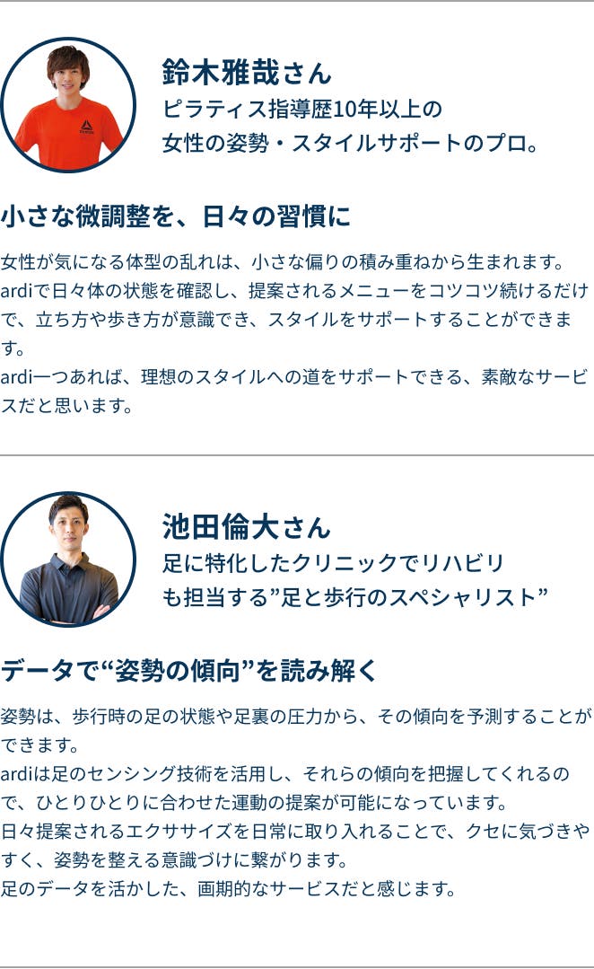 ardi本体と代々木のASHINO STUDIO体験がセットに。データ解析と専門トレーニングで姿勢をサポート。