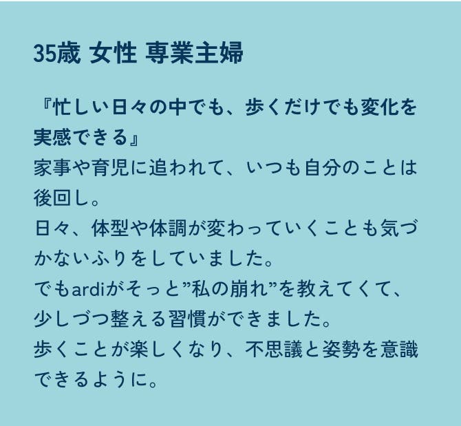 ardiは、人間工学や行動心理学をベースにしたAIと、専門家監修のコーチングを融合。日々の身体の変化に寄り添い、「今日は歩幅が狭めです」などのアドバイスをスマホに届けます。